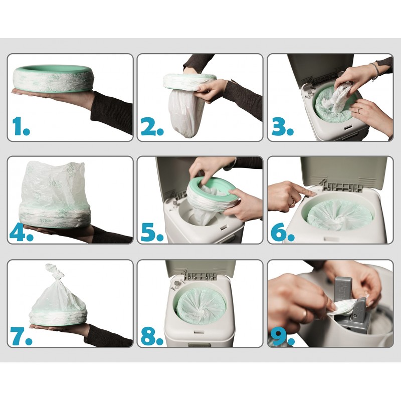 Kompakten in priročen. Koš lahko sprejme do 15 plenic! Po polnjenju posode smo za vaše udobje v notranjost vstavili rezilo za razrez folije kartuše, tako da za uporabo posode ne boste več potrebovali dodatnih orodij.