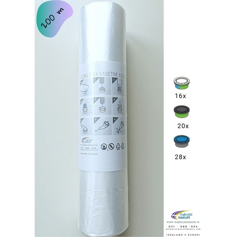 200-metrska polnilna folija je enaka 16 Sangenic, 28 Angelcare arba 20 Litter Locker II kasetam.